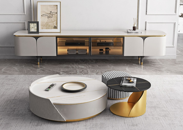 | G603 | G603电视柜 | 不锈钢镀金+烤漆面+岩板面+感应灯+合金门+茶色玻璃 | 200*40*48 |